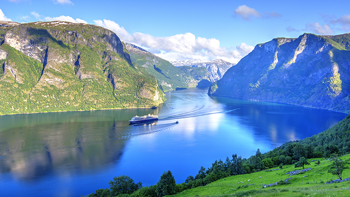 The cruise will take you deep into Norway’s largest Sognefjord, revealing mind-blowing scenery of dramatic cliffs and deep blue waters. Enjoy the breathtaking views of lush green landscapes—an unforgettable experience best enjoyed from onboard the ship.